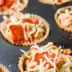 - Evenly divide the batter among the muffin tins. Sprinkle the remaining ½ cup of cheese and a few pieces of pepperoni on top of each muffin.