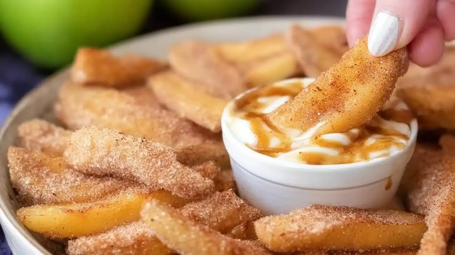 Deliciously crispy apple fries served with a creamy dip, reminiscent of nostalgic childhood snacks.