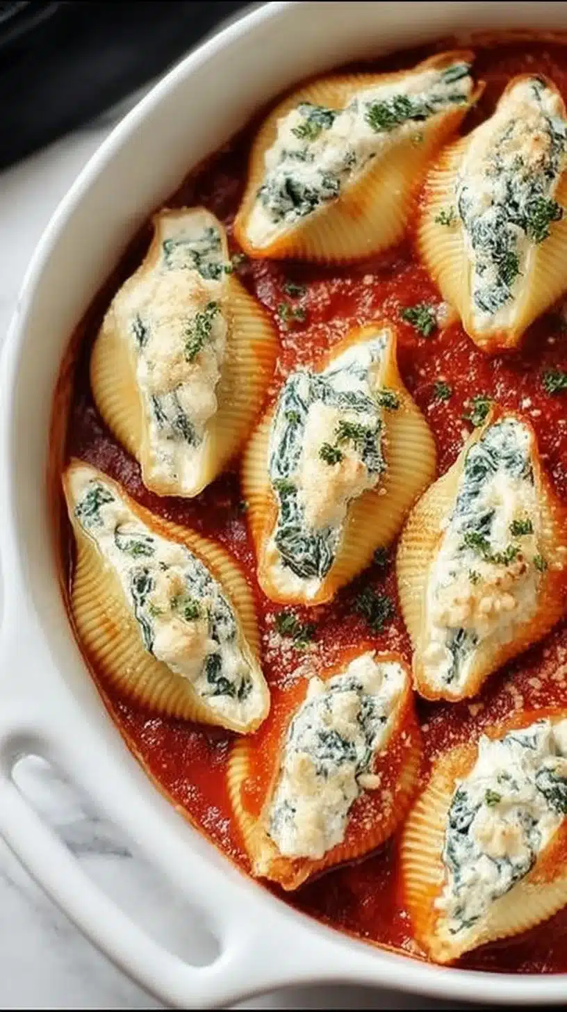 - Place the stuffed shells in the dish and top with the remaining marinara sauce.