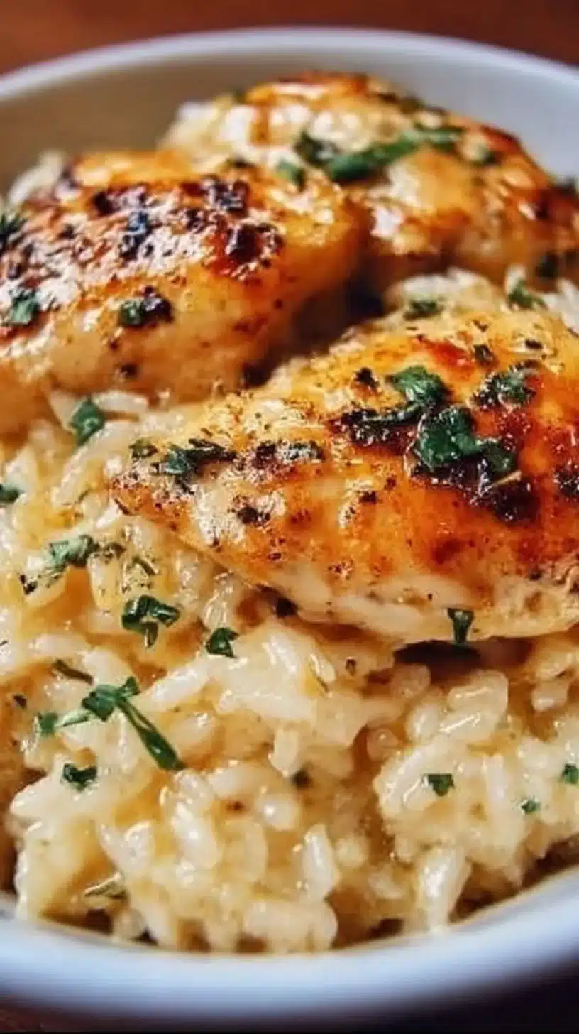 Delicious Chicken Rice Casserole topped with herbs and spices in a baking dish