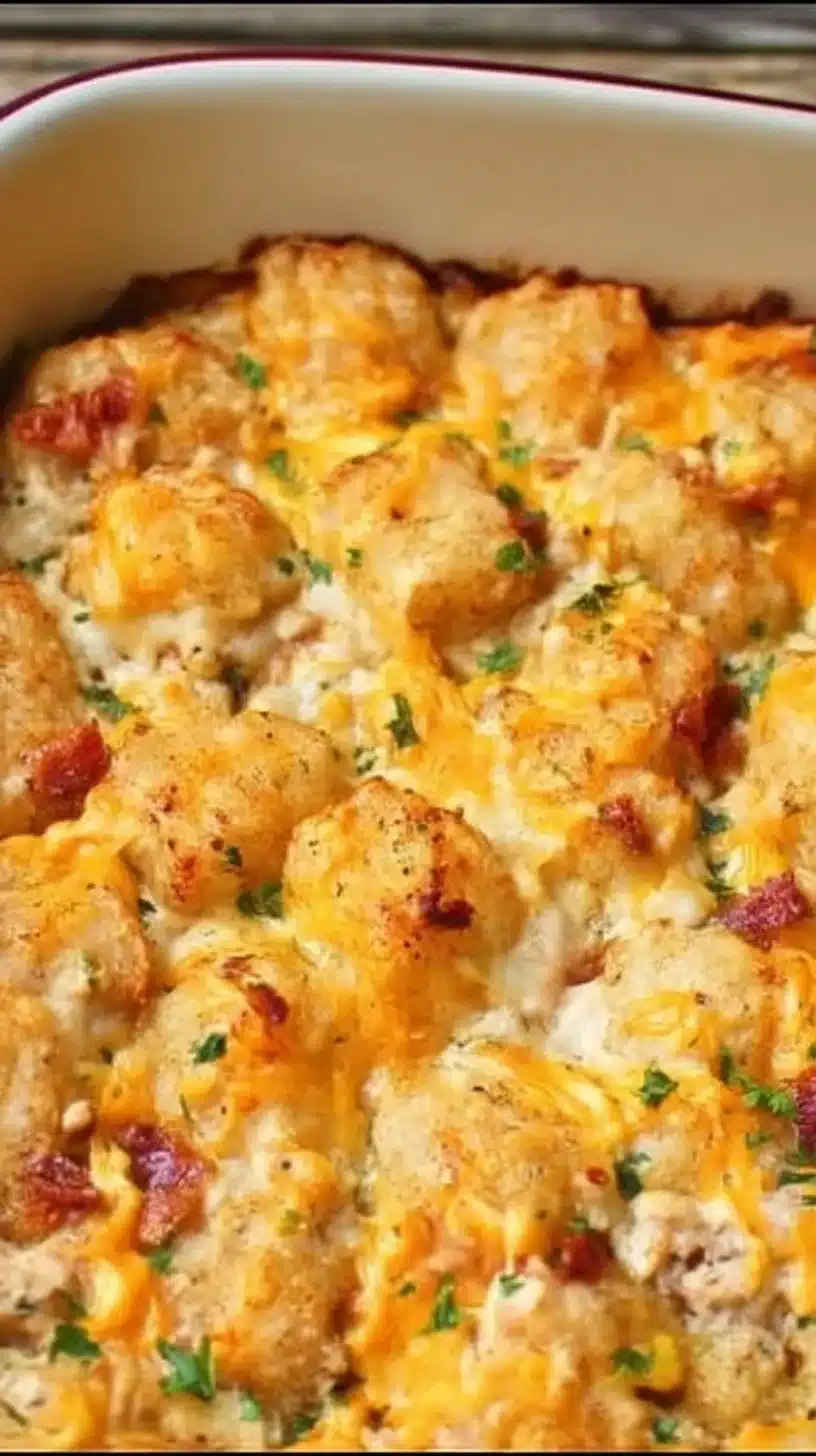 Cracked Out Chicken Tater Tot Casserole is a fun and delicious dish that brings comfort food to a whole new level. It combines tender chicken, crispy tater tots, rich cheese, and savory bacon all in one pan. This casserole is easy to prepare, making it perfect for busy weeknights or family gatherings. Plus, it can please both kids and adults alike!