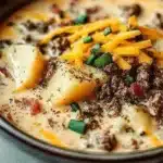 Alright, here’s the scoop (pun totally intended): this soup isn’t just another one of those “my mom used to make this” recipes that makes you feel all nostalgic. It’s like a cheeseburger and a bowl of warm happiness had a baby—sweet, creamy, and super satisfying. You’ve got ground beef, melty cheese, and all those savory bits that make burgers great, but served up like a hug in a bowl. Talk about charm!