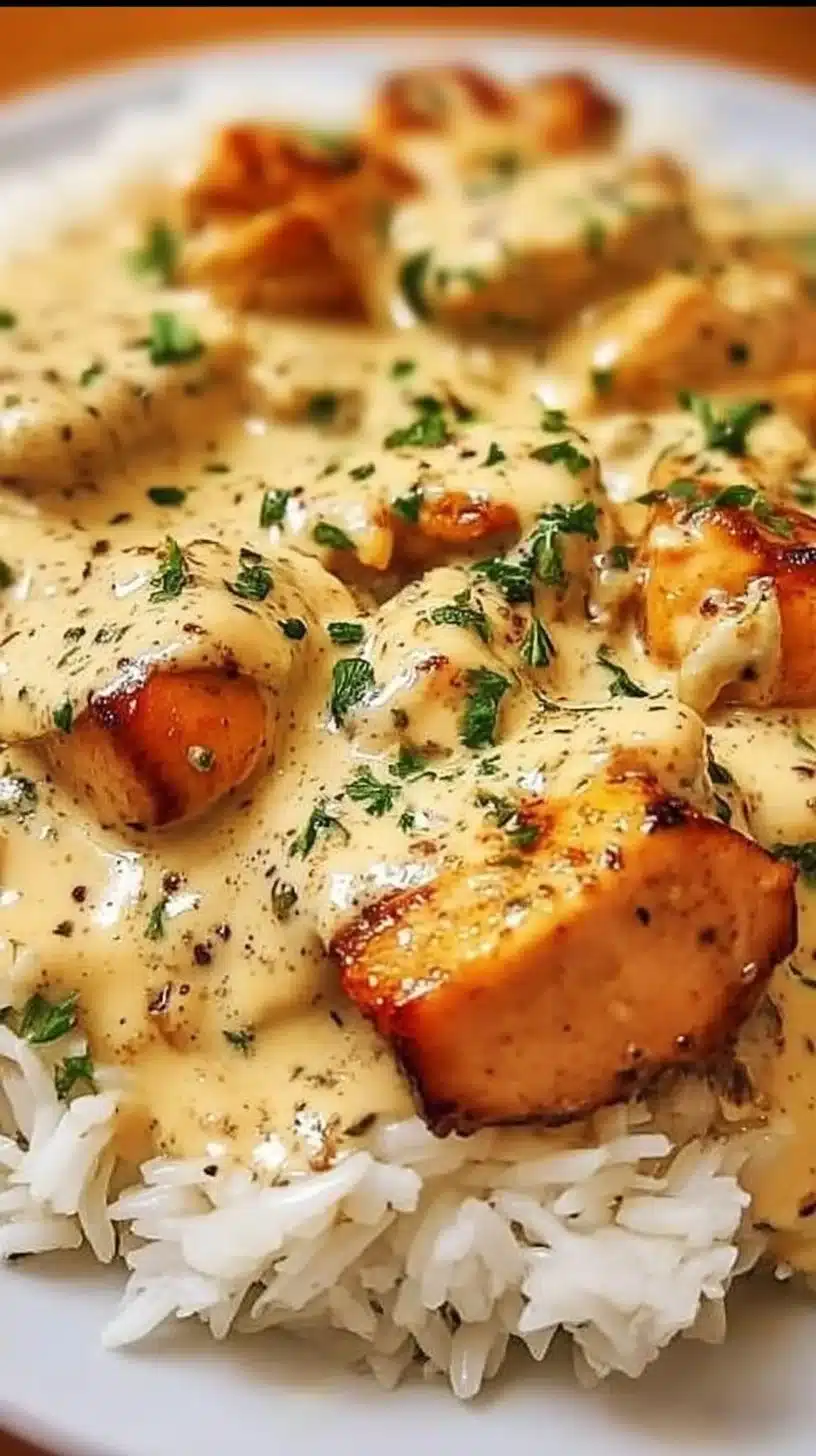 Creamy smothered chicken served over rice, topped with rich sauce and herbs.