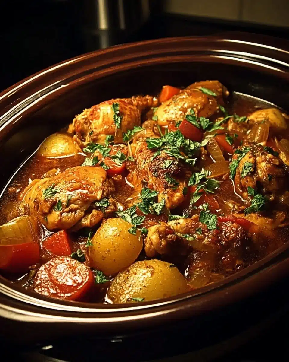 A cozy and flavorful Moroccan chicken stew, made effortlessly in a crockpot with a blend of spices, vegetables, and tender chicken thighs.