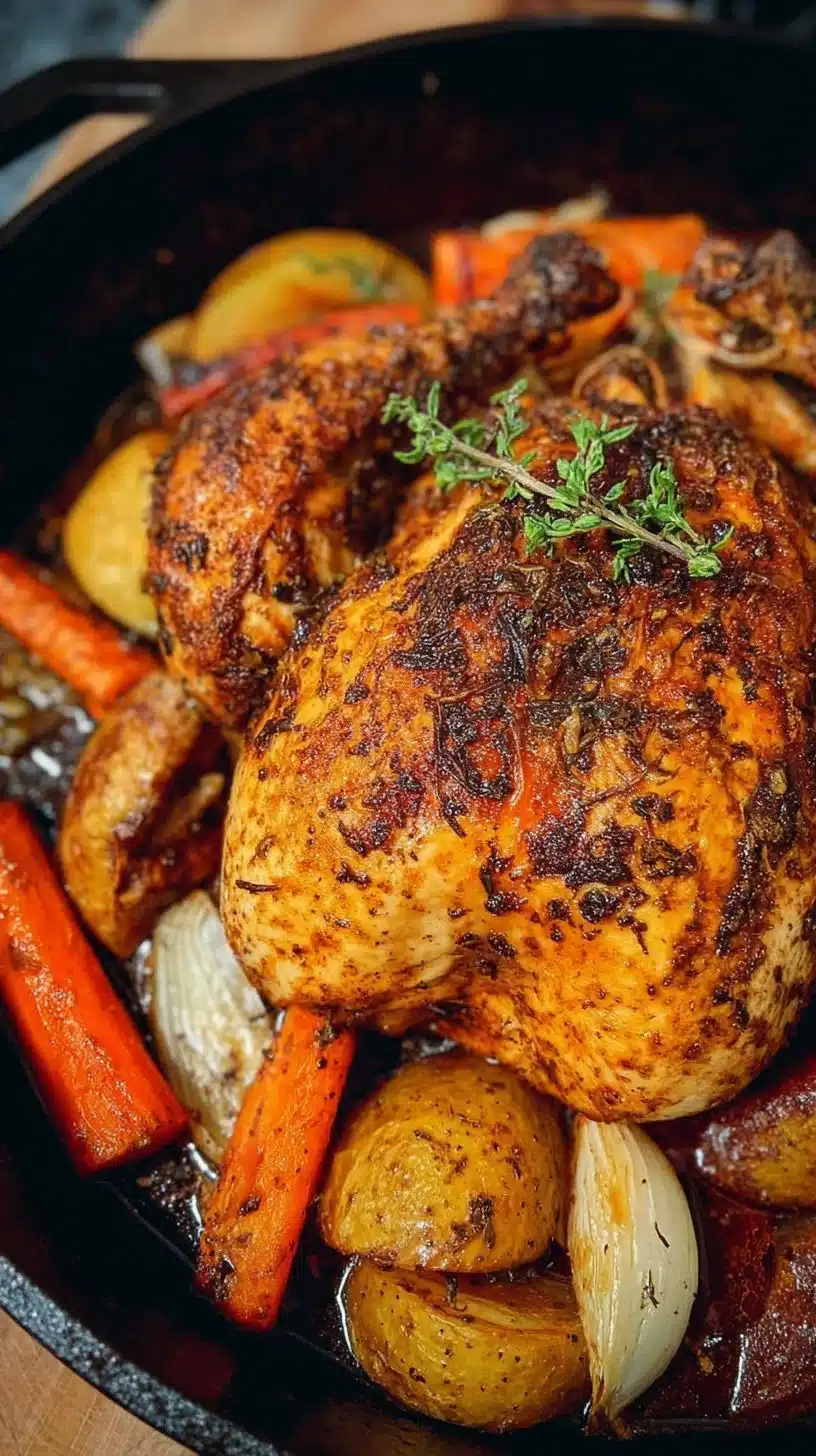 Serve the roast chicken on a large platter. Arrange the vegetables around the chicken for a beautiful presentation. Drizzle the chicken and vegetables with the flavorful pan juices for extra taste. It’s a hearty meal that can be enjoyed with some crusty bread or a fresh salad on the side.