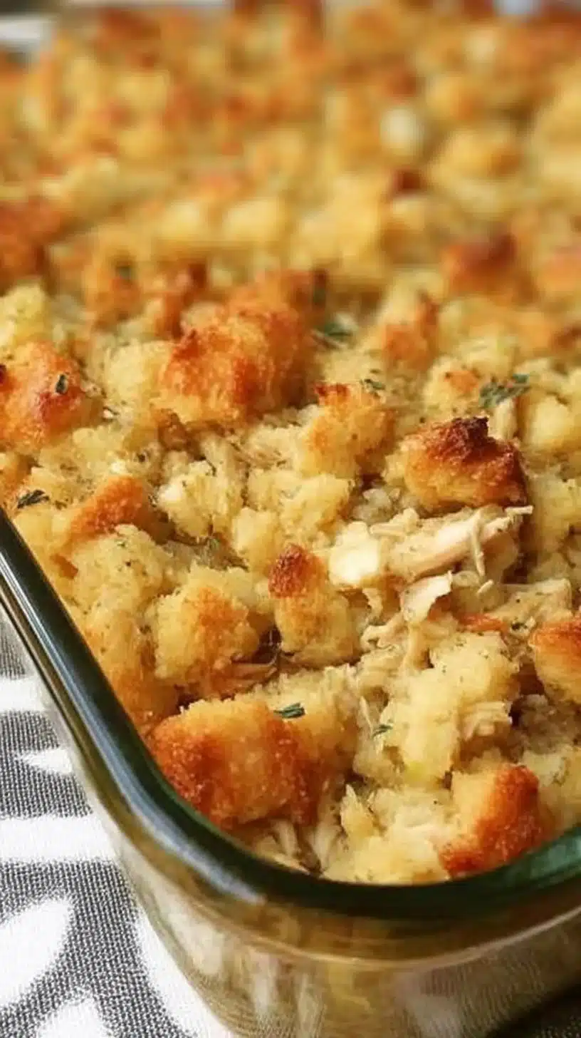 Delicious easy rotisserie chicken stuffing casserole served in a baking dish