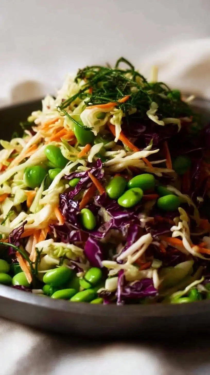 2. In a large bowl, combine the green cabbage, red cabbage, carrot, green onion, half of the edamame, and half of the seaweed salad. Drizzle about 3/4 of the dressing over the salad and toss gently. (The seaweed will mostly stay in clumps.)
