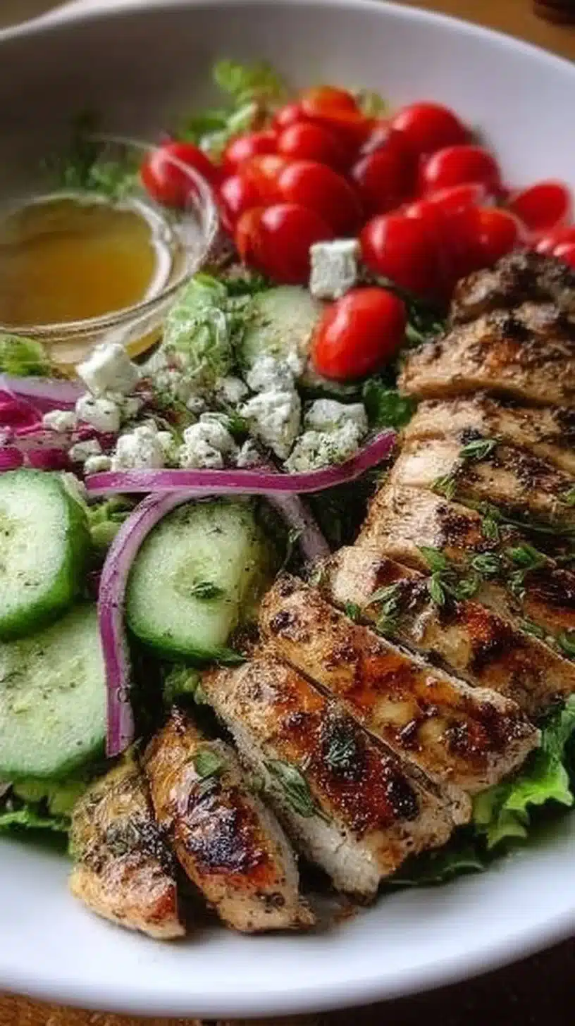 Savory grilled chicken salad with fresh greens and tangy vinaigrette dressing
