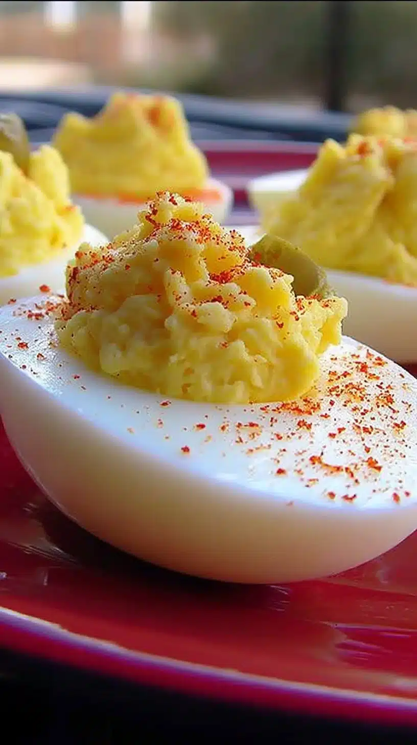 4. The Finishing Touch: Lightly dust each filled egg with paprika, and then top it off with an olive half—round side up, of course. Pop them in the fridge for about 20–30 minutes to chill out. Serving them cold? That’s how pros do it!