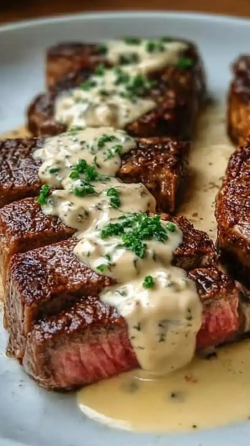 Steak with Creamy Garlic Sauce is best served hot. You can pair it with mashed potatoes, steamed vegetables, or a fresh salad for a complete meal. The creamy sauce is delightful drizzled on any side dish, adding extra flavor.