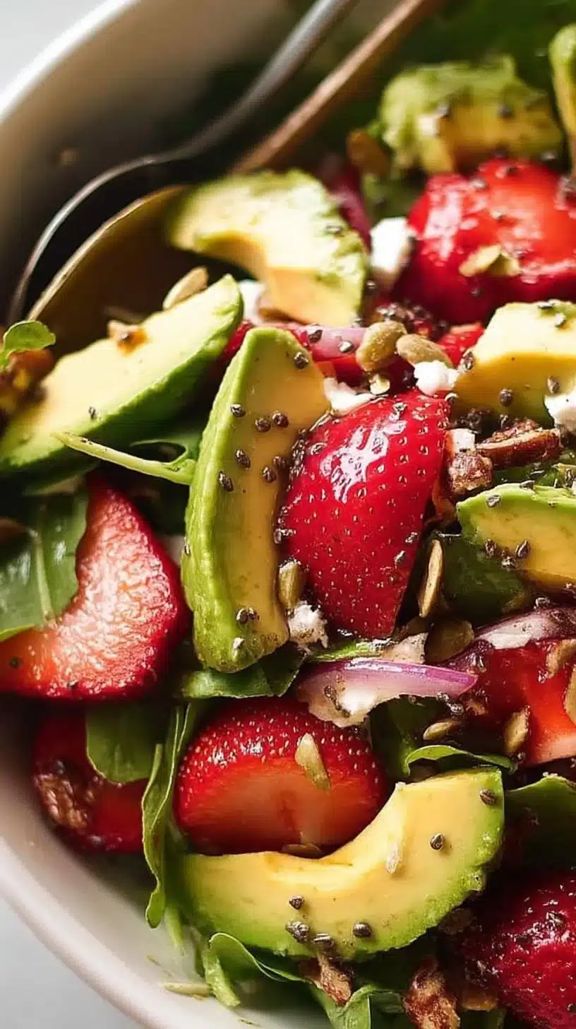 Serve the Strawberry Avocado Salad immediately for the best taste and texture. You can enjoy it as a main dish or as a side with grilled chicken or fish. For an added touch, sprinkle some extra feta cheese or poppyseeds on top before serving.