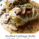 Hearty stuffed cabbage rolls filled with a delicious blend of ground beef and pork, rice, and smothered in a creamy mushroom sauce for a cozy meal.
