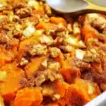Sweet potato and apple casserole topped with a crunchy pecan topping