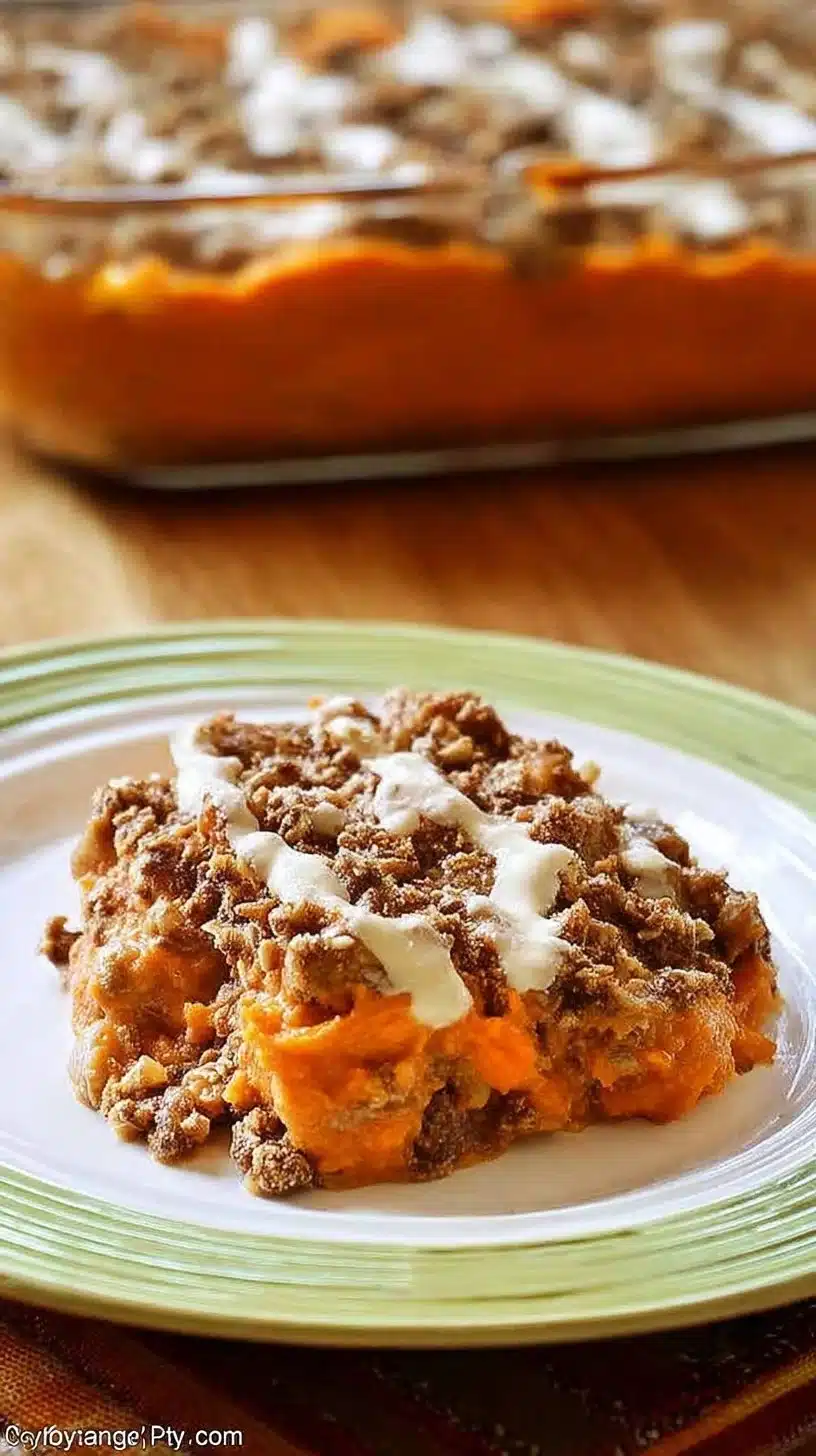 Sweet Potato Casserole topped with Oatmeal Cookie Crust served in a dish