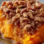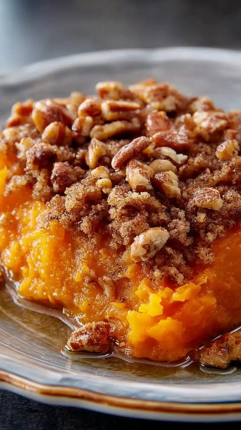 Sweet potato casserole topped with crunchy pecans, perfect for holiday meals