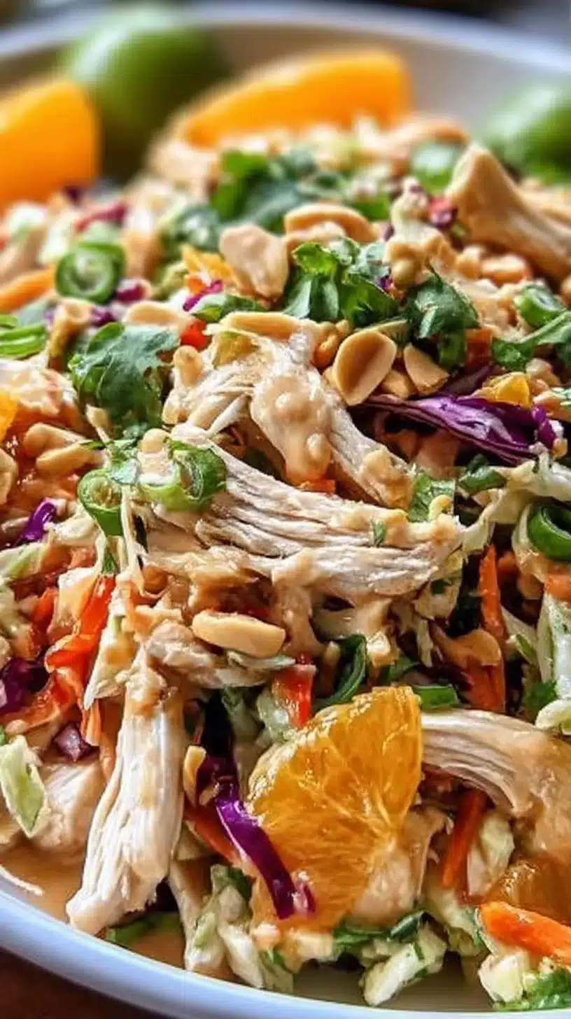 Serve the Thai Chicken Salad in a large bowl or on individual plates. It can be enjoyed on its own or paired with additional toppings like Chow Mein noodles, crispy wonton strips, or toasted sesame seeds for extra crunch. This salad is best served cold, making it a refreshing option for warm days or gatherings.