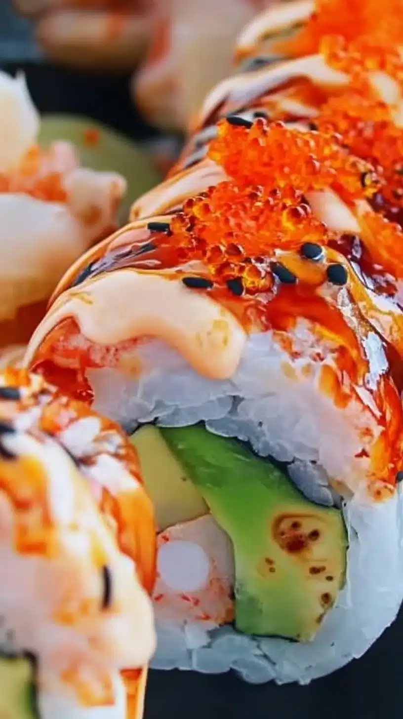 Delicious Volcano Roll sushi with spicy toppings and creamy sauces.