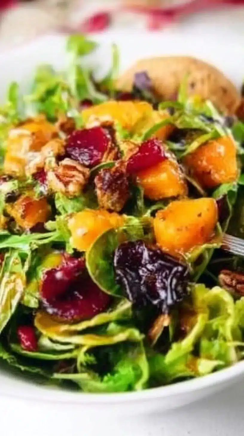 A cozy salad with roasted veggies, crunchy nuts, and a tangy Maple Dijon Dressing, perfect for winter nights.